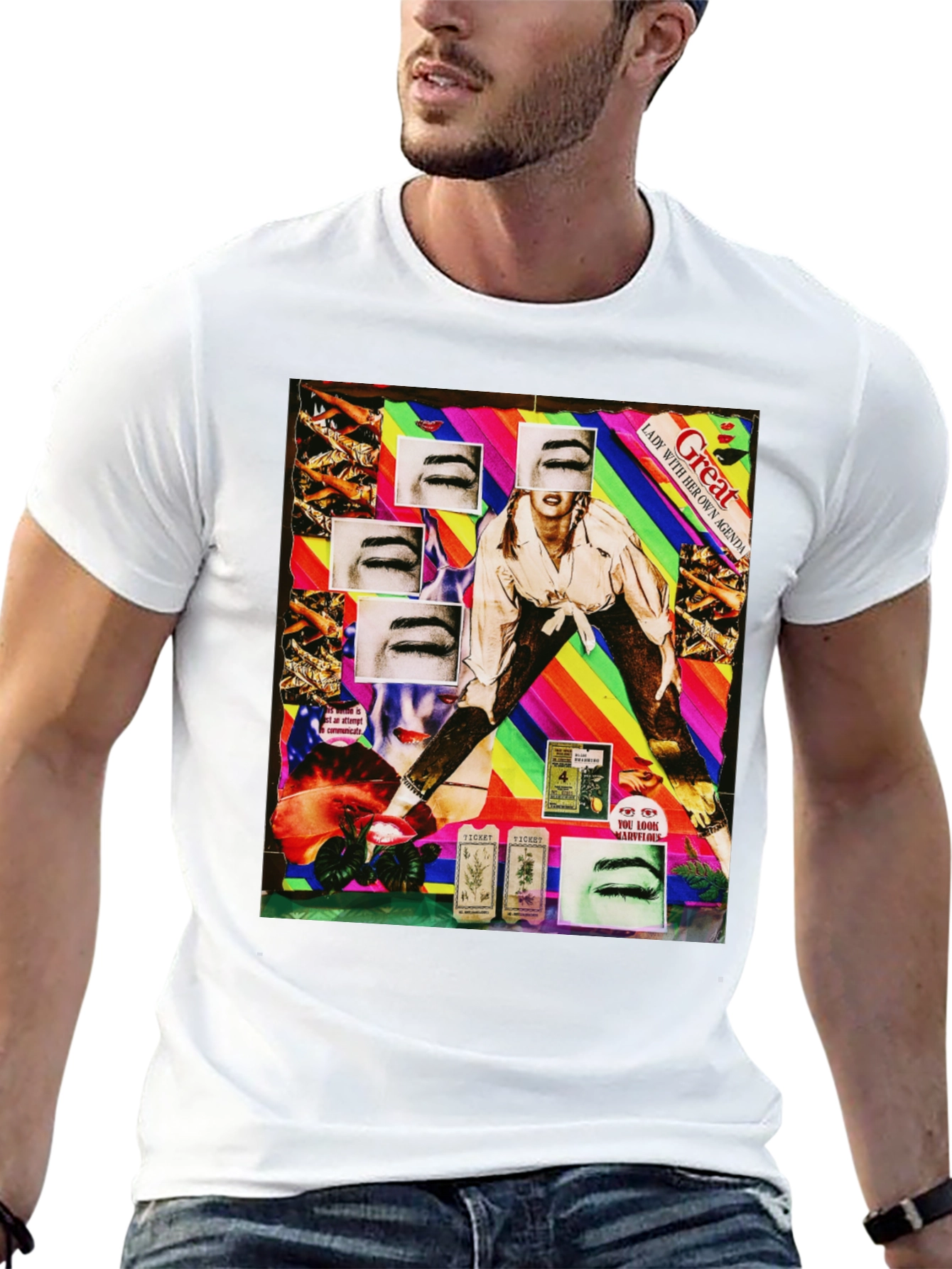 Make a bold statement with this eye-catching black t-shirt. The striking, abstract graphic print features a collage of images including portraits, text, and vibrant, rainbow-colored geometric shapes. The design is perfect for those who appreciate unique, artistic clothing. Made from a comfortable fabric, this t-shirt is suitable for everyday wear. Pair it with jeans or shorts for a casual, stylish look that shows off your individuality. Ideal for expressing your unique style and turning heads wherever you go.