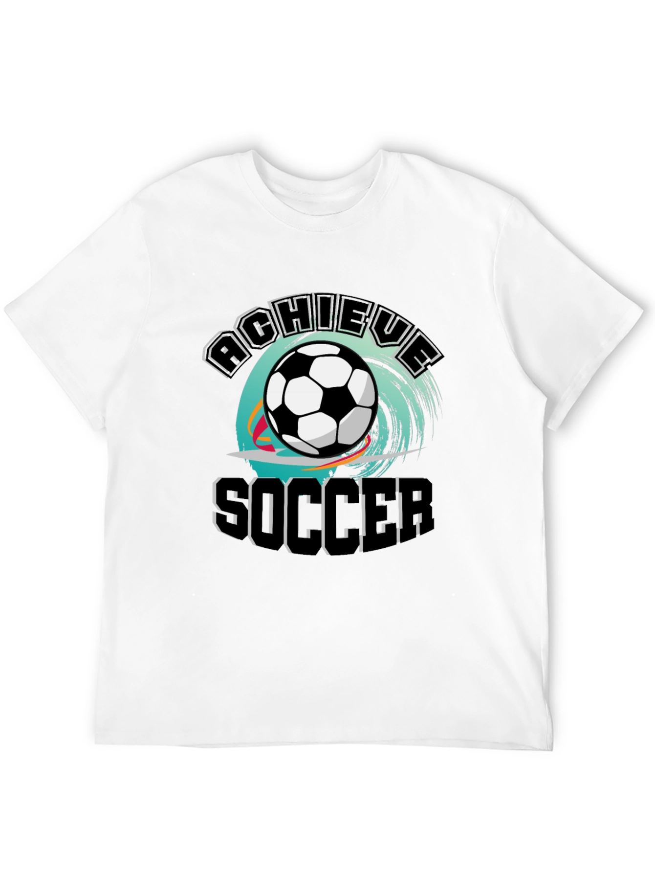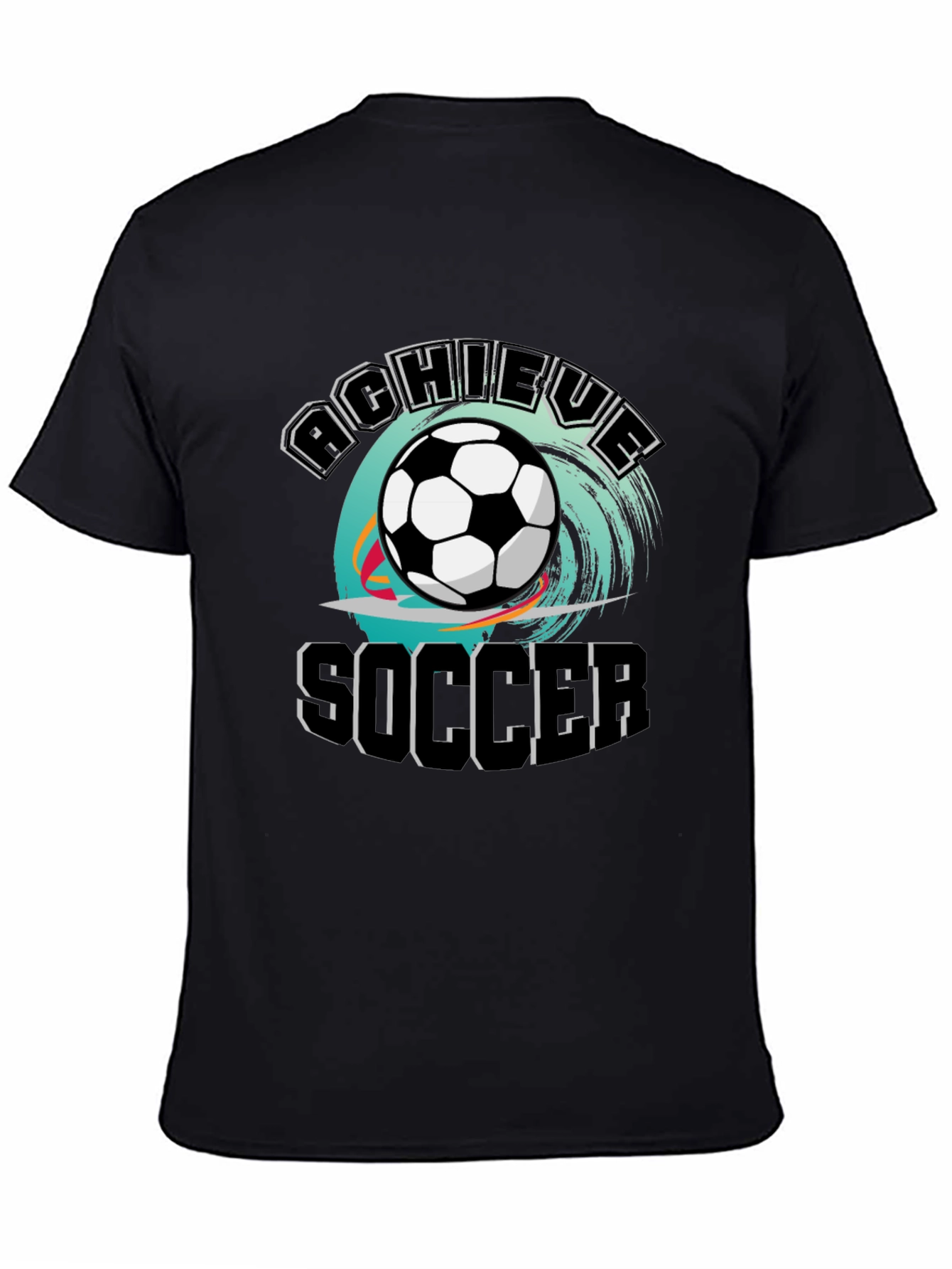 Show your love for the game with this stylish black t-shirt. Featuring a striking graphic design with the word "ACHIEVE" arched above a soccer ball and the word "SOCCER" below. This tee offers a comfortable fit and a bold statement. The vibrant design is eye-catching. Perfect for athletes, sports fans, or anyone who appreciates unique apparel, this t-shirt is ideal for casual outings, workouts, or showing team spirit. Made from comfortable materials, it ensures all-day wearability. Elevate your wardrobe with this sporty and trendy t-shirt.