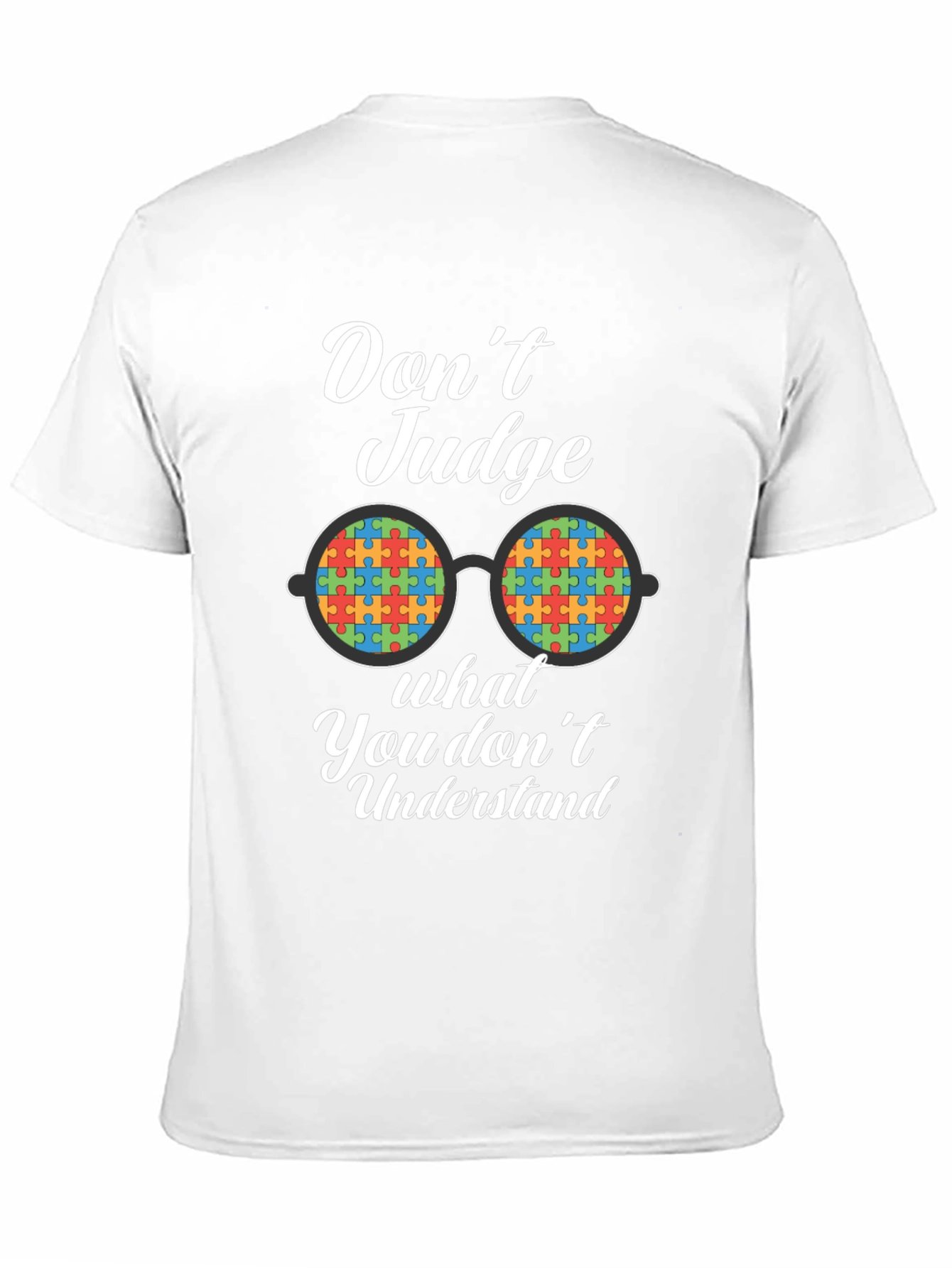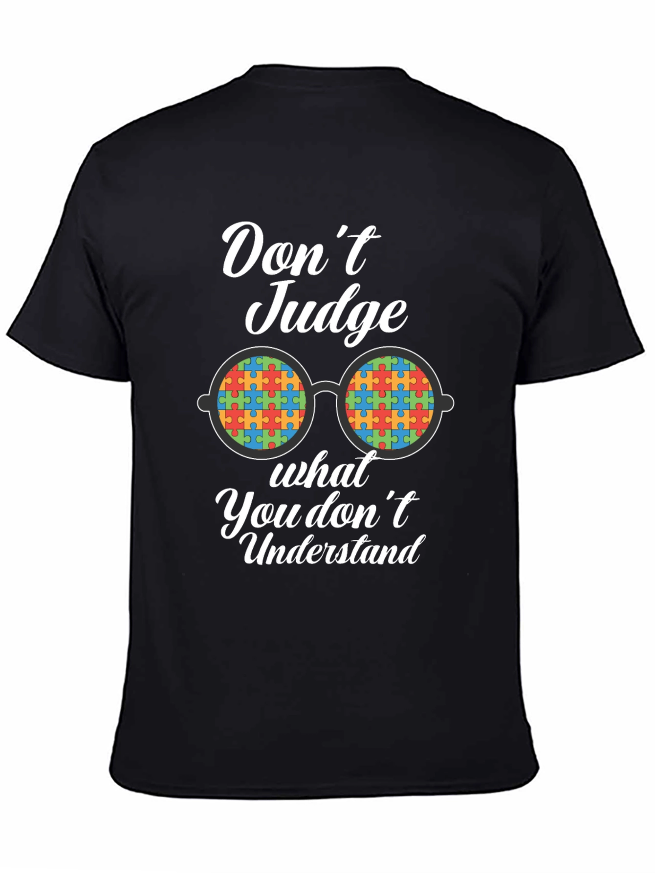 Show your support with this black autism awareness t-shirt. Featuring the message "Don't Judge what You don't Understand", it includes glasses filled with a colorful puzzle piece design. This tee promotes understanding and acceptance. Soft, comfortable fabric makes it perfect for everyday wear, autism awareness events, or as a thoughtful gift. Stand out and make a statement with this unique and meaningful shirt!