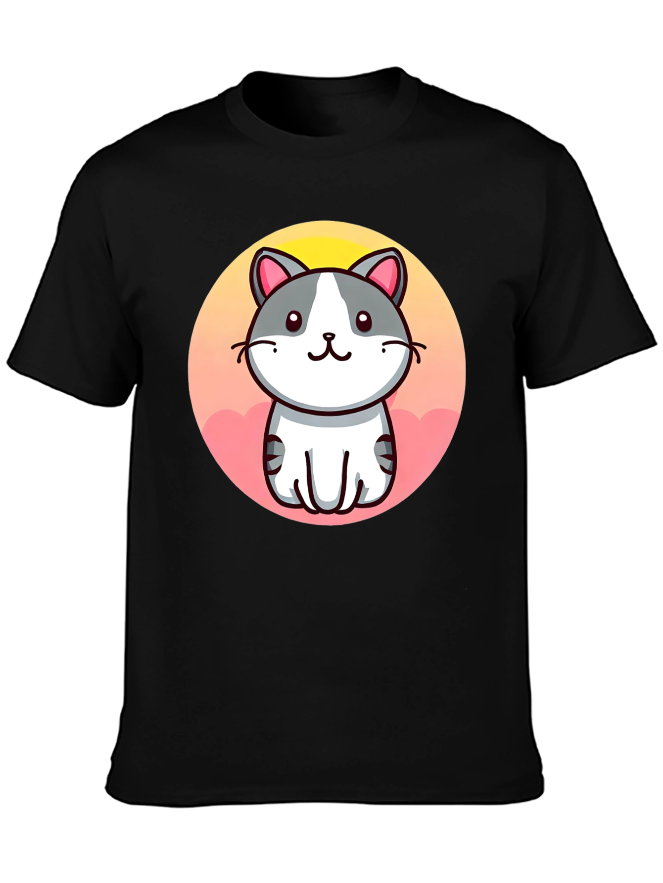 Show off your love for cats with this adorable black t-shirt! This eye-catching tee features a cute, cartoon-style cat graphic set against a colorful circular backdrop. The cat is gray and white with pink ears, offering a playful, cheerful vibe. Made from comfortable, breathable fabric, this t-shirt is perfect for casual wear, lounging at home, or a fun day out. Pair it with your favorite jeans or shorts for an effortlessly stylish look. A must-have for cat lovers and anyone who enjoys a touch of whimsy in their wardrobe!