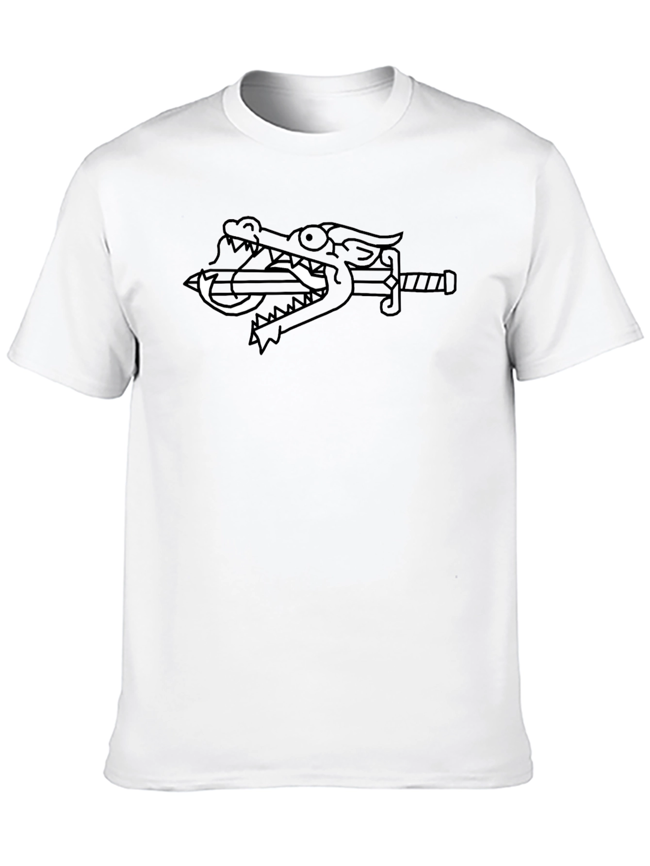 This stylish black t-shirt features a unique dragon and sword graphic design. The dragon's head is intricately drawn, biting down on a sword. Made from a comfortable-looking material, this shirt is perfect for casual wear or making a statement. Its bold design is sure to turn heads and spark conversation. The classic fit makes it suitable for everyday use, and the striking graphic adds an edgy touch to any outfit. Ideal for those who appreciate unique and eye-catching apparel. Add this standout piece to your wardrobe today!