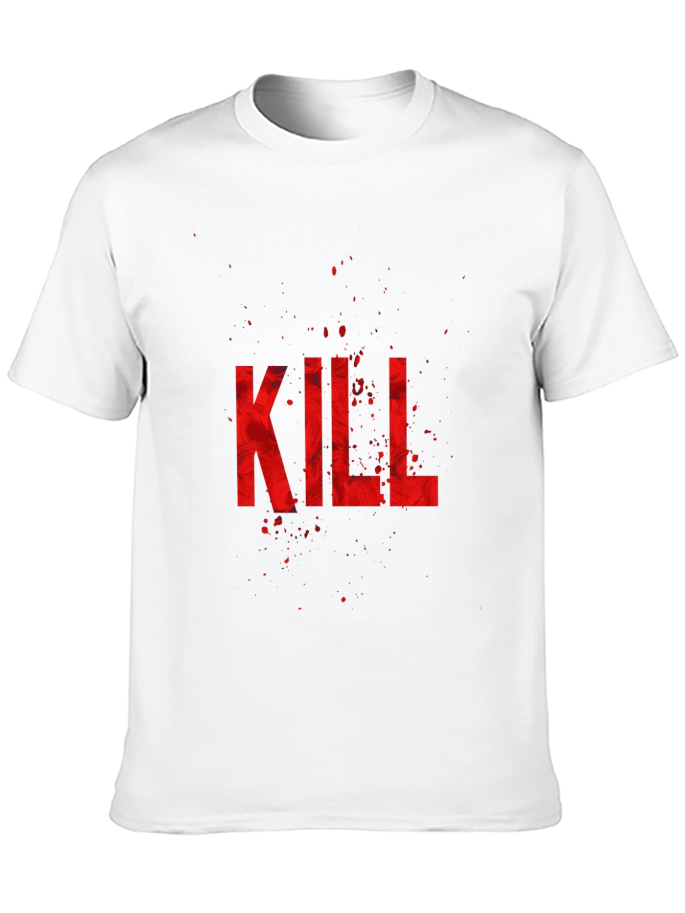 Make a bold statement with this black T-shirt featuring a striking "KILL" graphic. The red lettering design gives it a distinctive edge. Crafted from what appears to be a comfortable cotton blend, this shirt is perfect for casual wear. The short-sleeved design and classic crew neck offer a relaxed fit suitable for everyday activities. Whether you're looking to express your rebellious side or simply want a standout piece for your wardrobe, this tee is an excellent choice. Pair it with jeans or shorts for a casual yet impactful look. Ideal for concerts, casual hangouts, or making a statement.