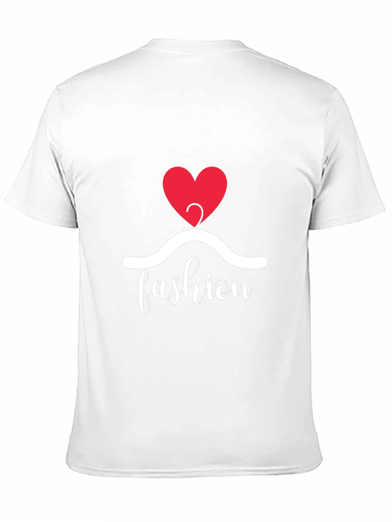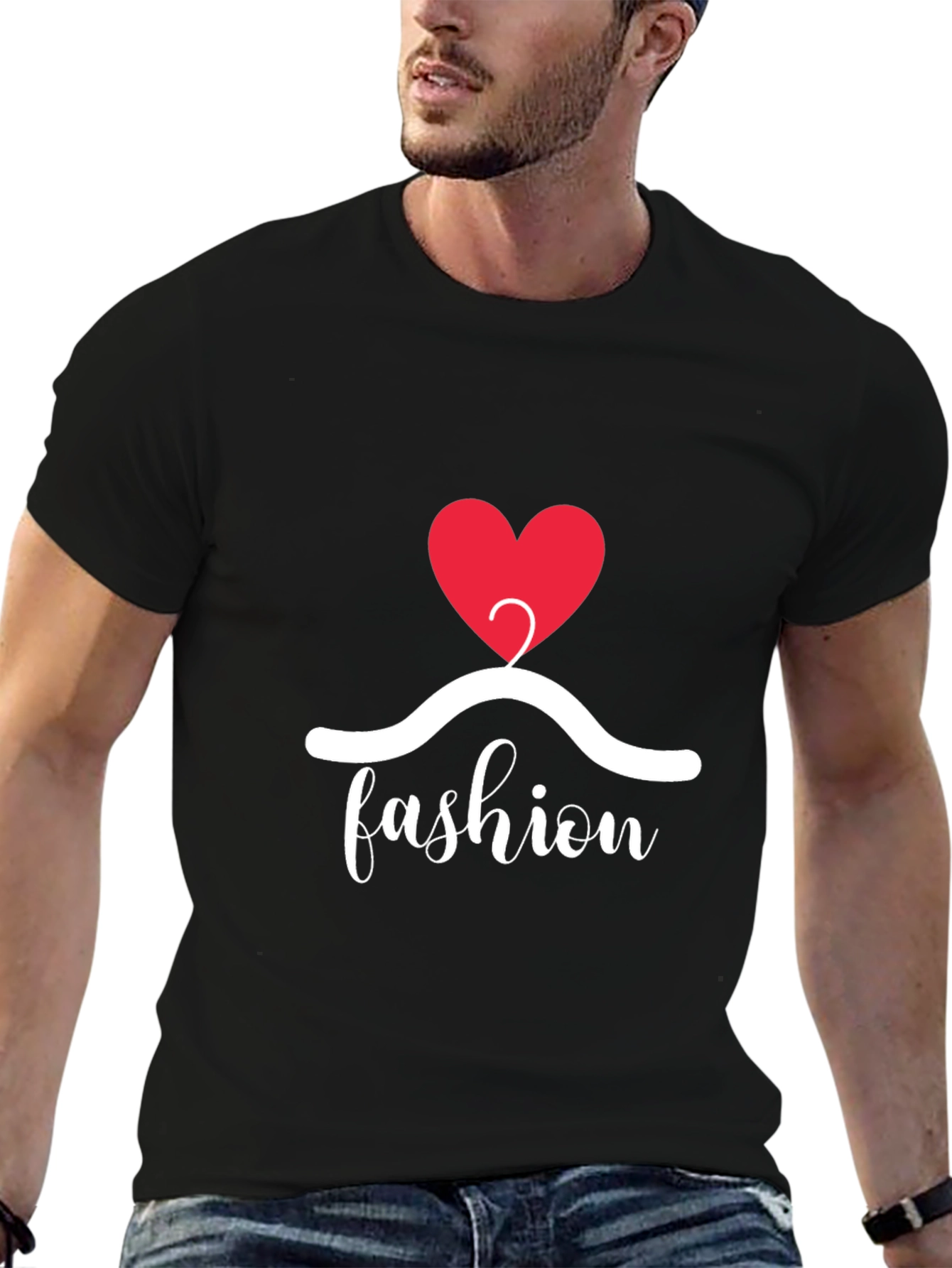 Show off your love of fashion with this stylish black t-shirt. The design features a bold red heart poised above a sleek, white hanger graphic and the word "fashion" in a playful script. Crafted from a comfortable material, this tee is ideal for everyday wear. Whether you are hitting the town or relaxing at home, this unique t-shirt will keep you looking and feeling great. Its eye-catching design is sure to spark conversation and showcase your style. Perfect for fashion enthusiasts and trendsetters alike.