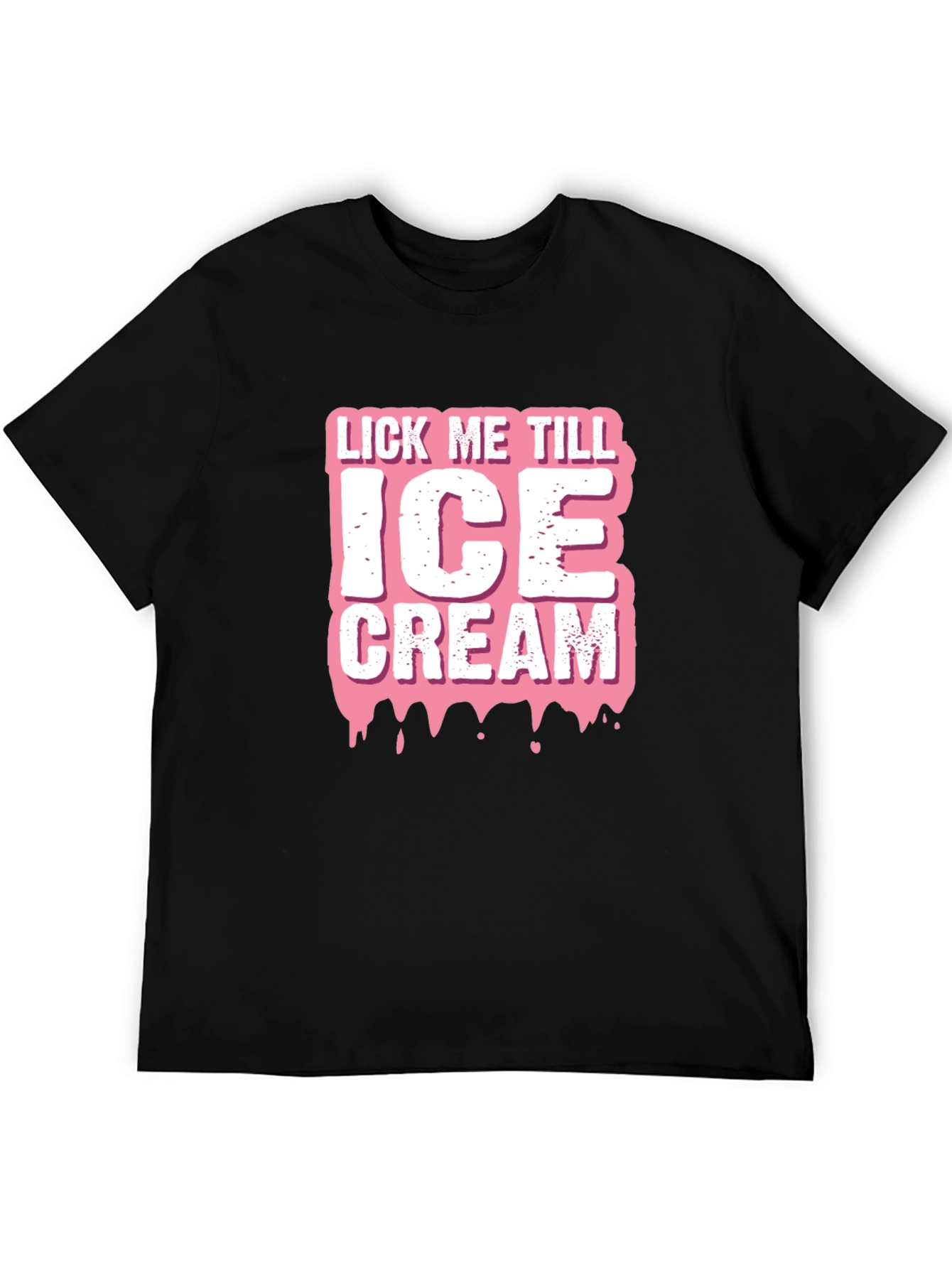 Express your fun side with this eye-catching black graphic t-shirt. The bold print features the phrase 'Lick Me Till Ice Cream' in a playful, dripping font outlined in pink. Made from soft, breathable fabric, this shirt offers both style and comfort. The classic fit makes it versatile for casual outings, parties, or lounging at home. Whether you're an ice cream enthusiast or just love quirky fashion, this tee is sure to make a statement and spark conversations. Pair it with jeans, shorts, or a skirt for a unique and trendy look.