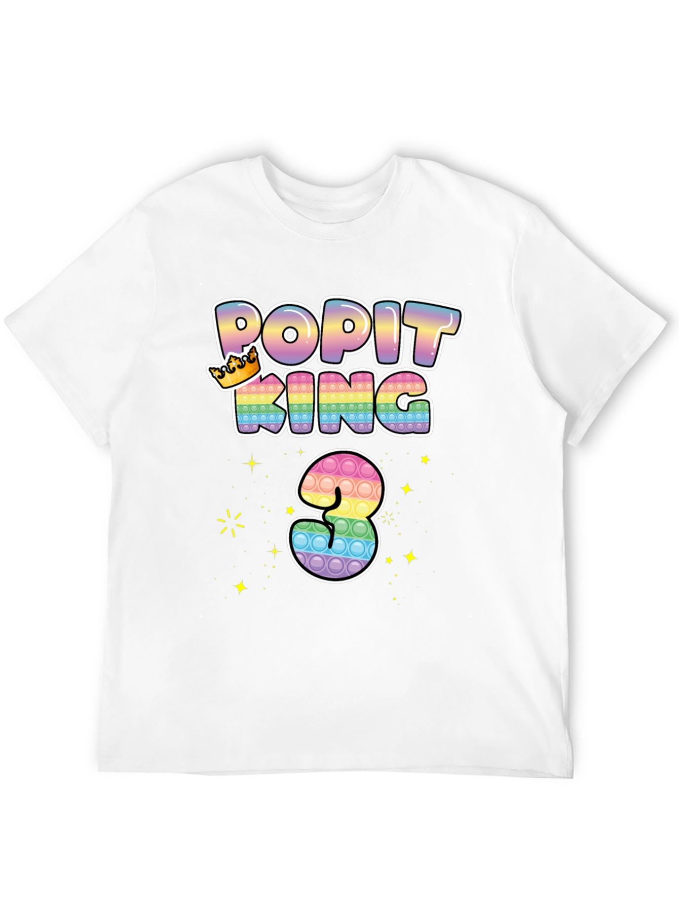 Celebrate a special 3rd birthday with this fun and vibrant Pop It King t-shirt! The shirt features a colorful "Pop It King" design with rainbow bubble textures. A playful crown sits atop the text, adding a regal touch. The number "3" is also rendered in the same eye-catching pop it style, surrounded by whimsical star accents. This tee is perfect for a birthday party, family photos, or everyday wear. Let your little one celebrate their big day in style with this adorable and trendy shirt!