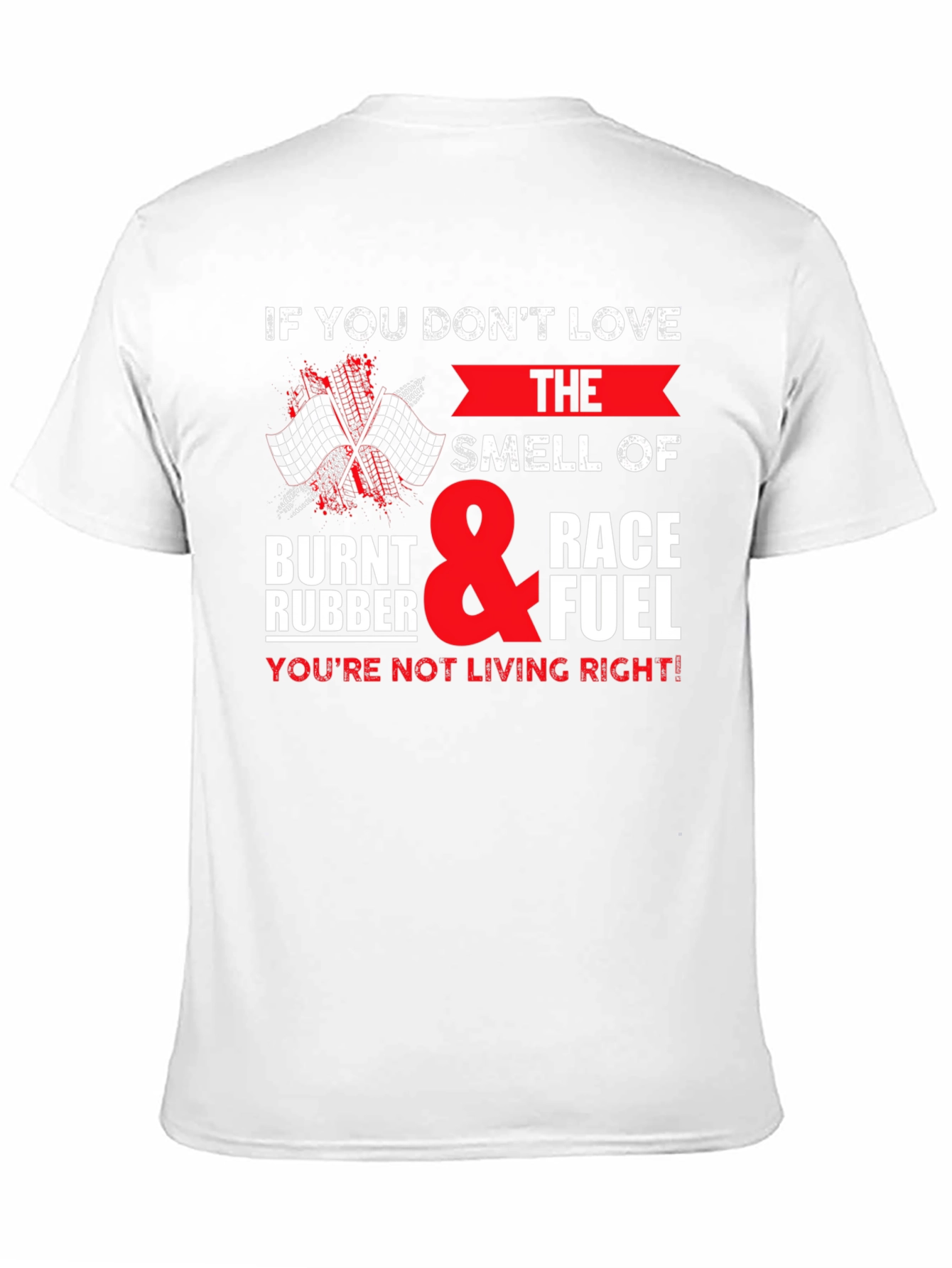 Rev up your wardrobe with this bold black t-shirt, designed for racing enthusiasts! Featuring a vibrant graphic print, the design incorporates a checkered flag and the saying, "If you don't love the smell of burnt rubber & race fuel, you're not living right!" in eye-catching white and red fonts. This tee is perfect for showing your love of racing at the track, car meets, or just everyday wear. Made from comfortable, breathable fabric, it's built for both style and comfort. A great gift idea for the gearhead in your life!