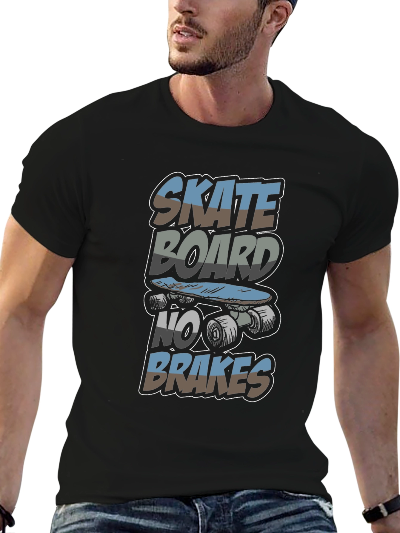 Show off your love for skateboarding with this stylish graphic t-shirt. The design features bold text reading "Skateboard No Brakes" alongside a cool skateboard illustration. The colors used create a vintage, street-style vibe. Made from comfortable fabric, this tee is perfect for casual wear, hitting the skate park, or just hanging out with friends. It’s a great conversation starter for any skater or anyone who appreciates unique graphic designs. Express your passion for the skate culture with this eye-catching t-shirt. Available in black for a classic look. It is a must-have addition to any wardrobe!