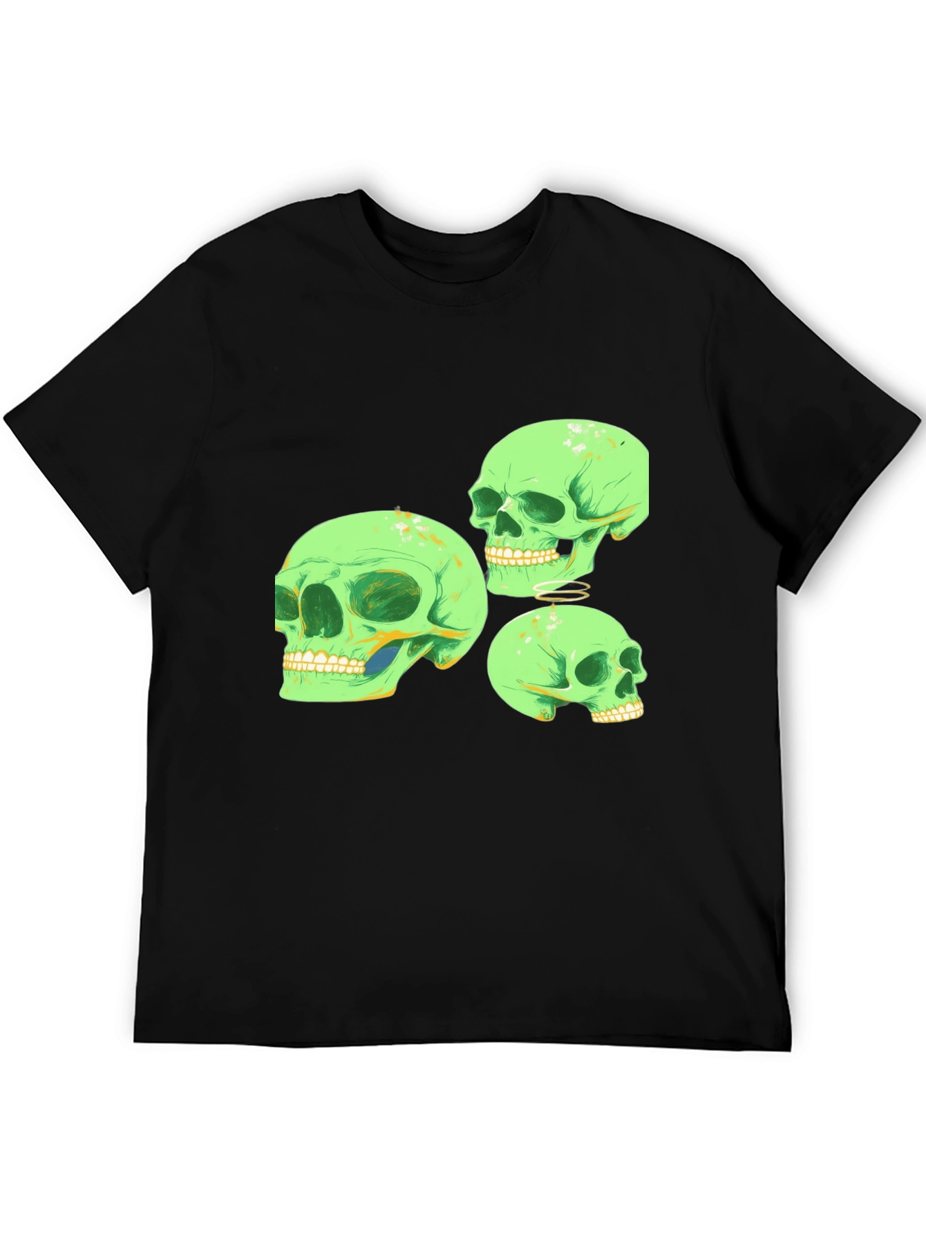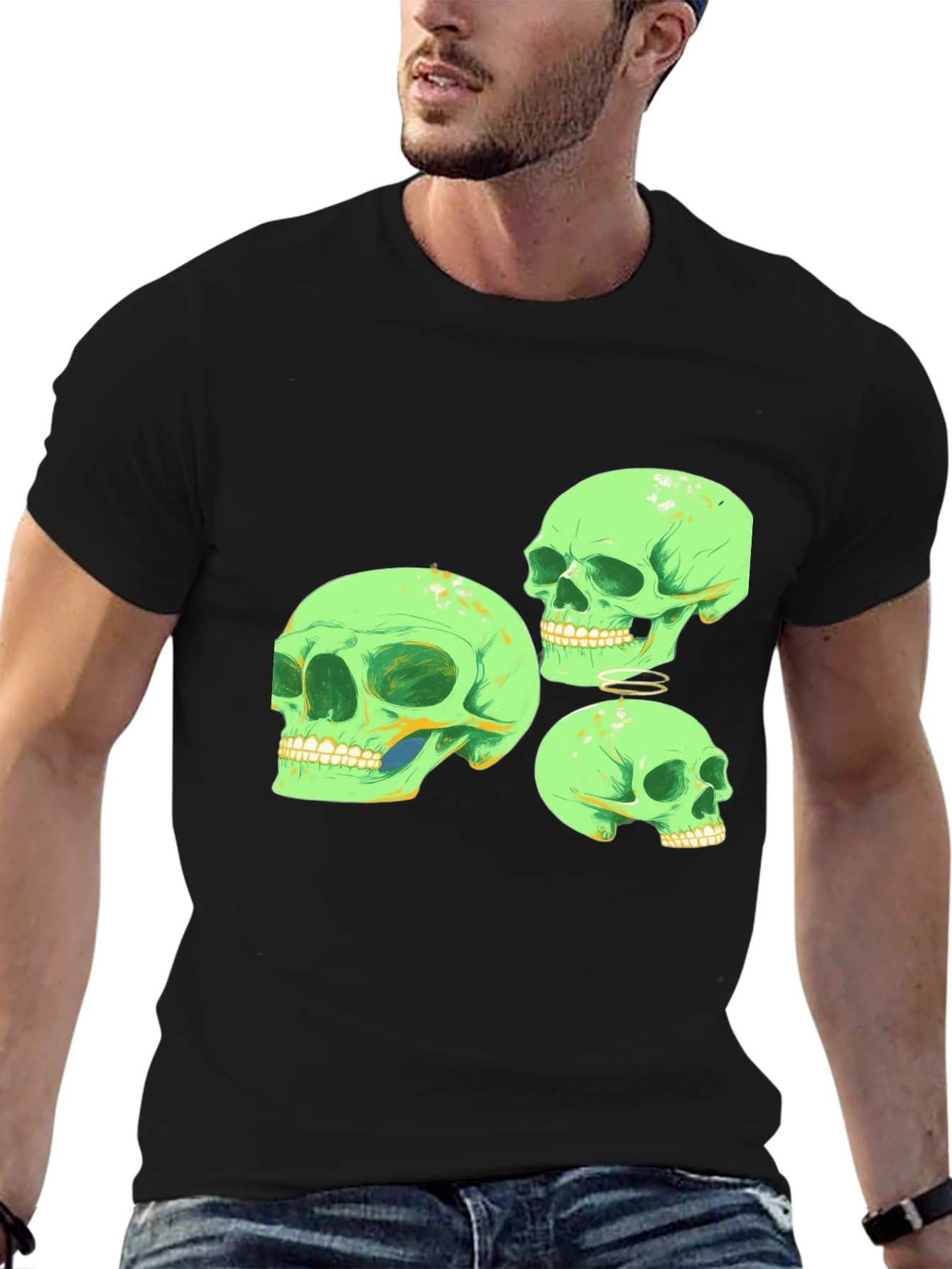 Showcase your unique style with this eye-catching men's t-shirt. The shirt features a bold graphic of three green skulls. Made from a comfortable material, this black tee offers a relaxed fit that's perfect for everyday wear. Dress it up with a jacket for a night out or keep it casual with jeans. A great addition to any modern wardrobe. This skull graphic tee is sure to make a statement wherever you go. This tee is perfect for any casual outing or a night out with friends.