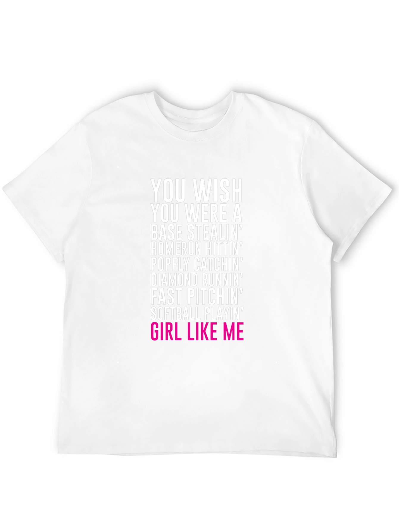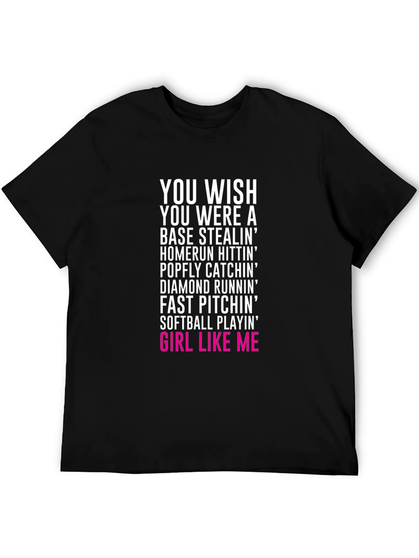 Show off your love for softball with this stylish graphic t-shirt. The shirt features a bold design with the phrase "YOU WISH YOU WERE A BASE STEALIN', HOMERUN HITTIN', POPFLY CATCHIN', DIAMOND RUNNIN', FAST PITCHIN', SOFTBALL PLAYIN' GIRL LIKE ME." The print is in white and pink, making it stand out against the solid black background of the shirt. Perfect for wearing to games, practices, or just around town, this tee is sure to turn heads. The classic crew neck and short sleeves offer a comfortable fit for everyday wear.