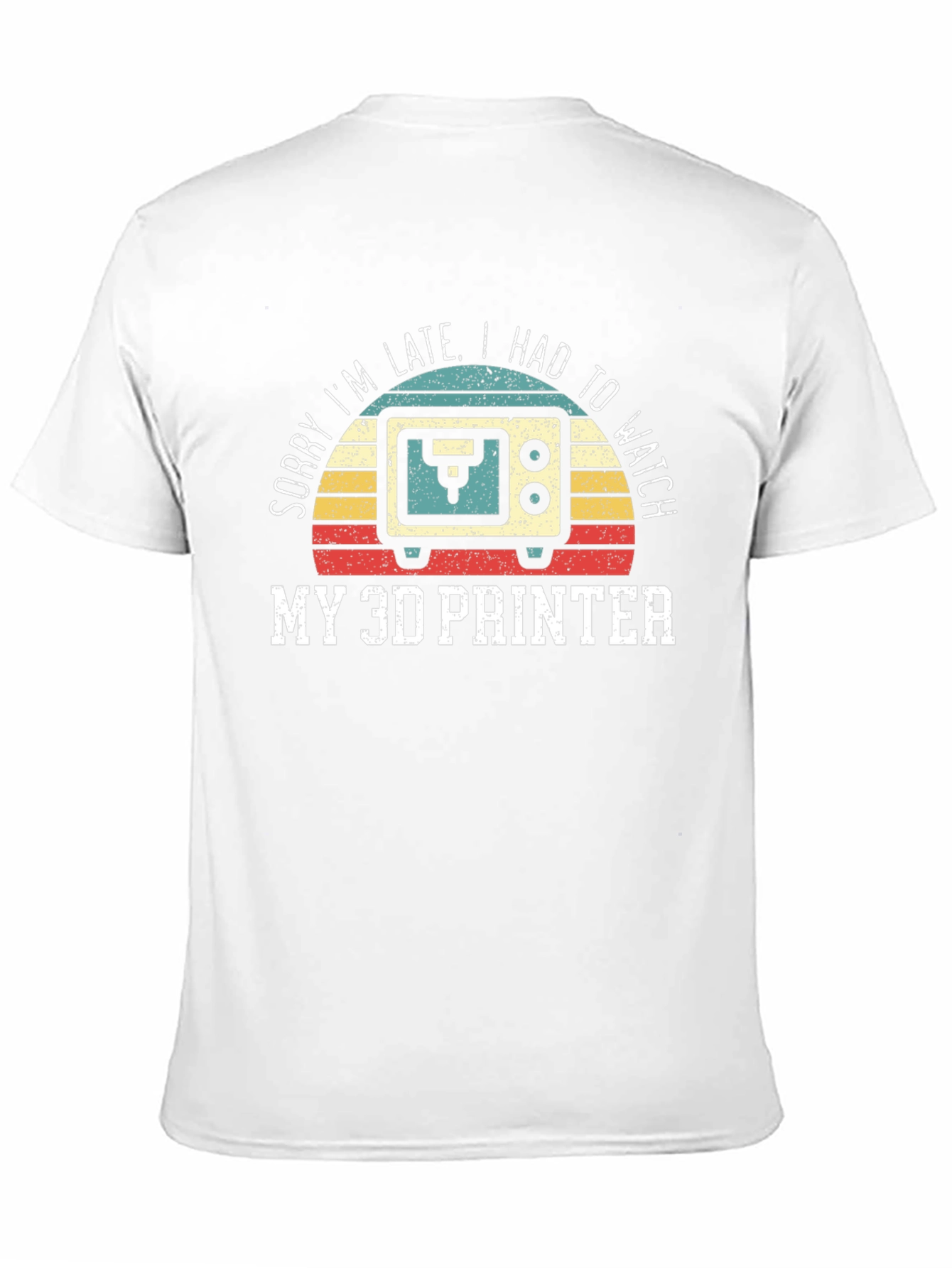 This classic black t-shirt features a fun and relatable graphic for 3D printing enthusiasts. The design includes the phrase 'Sorry I'm Late, I Had to Watch My 3D Printer' in a retro-style font, accompanied by a colorful illustration of a 3D printer. The shirt appears to be made of a soft and comfortable material, perfect for everyday wear. Ideal for showcasing your passion for 3D printing, this shirt is a great conversation starter and a must-have addition to any maker's wardrobe. Whether you're at a convention, in the lab, or just hanging out, let everyone know your priorities are straight!