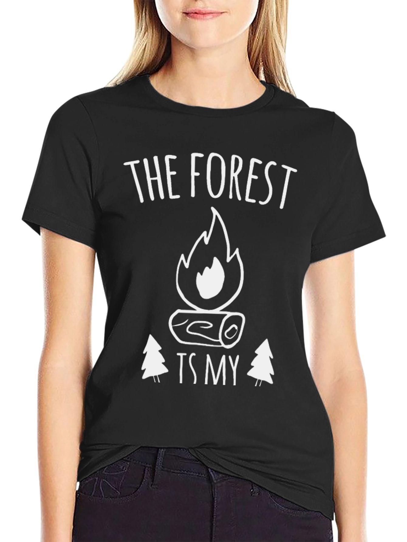 Embrace the outdoors with this comfortable black t-shirt. Featuring a whimsical design of a campfire and two pine trees, accompanied by the words "The Forest Is My," this tee is perfect for nature lovers and camping enthusiasts. Made from a soft, breathable fabric, it provides all-day comfort. Ideal for casual wear, hiking trips, or campfire gatherings. Show off your passion for the great outdoors with this eye-catching t-shirt.