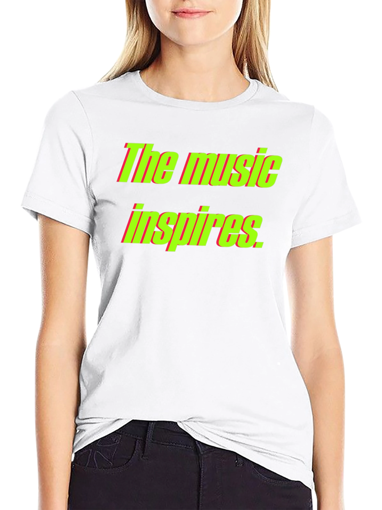 Elevate your casual style with this eye-catching black graphic t-shirt. Featuring vibrant, neon green text with a red shadow effect, the shirt boldly states, "The music inspires." The classic crew neck and short sleeve design make it a comfortable and versatile addition to any wardrobe. Made from what appears to be a soft and breathable fabric, this tee is perfect for everyday wear, music festivals, or casual outings. Pair it with jeans, shorts, or joggers for an effortlessly cool look that showcases your love for music.