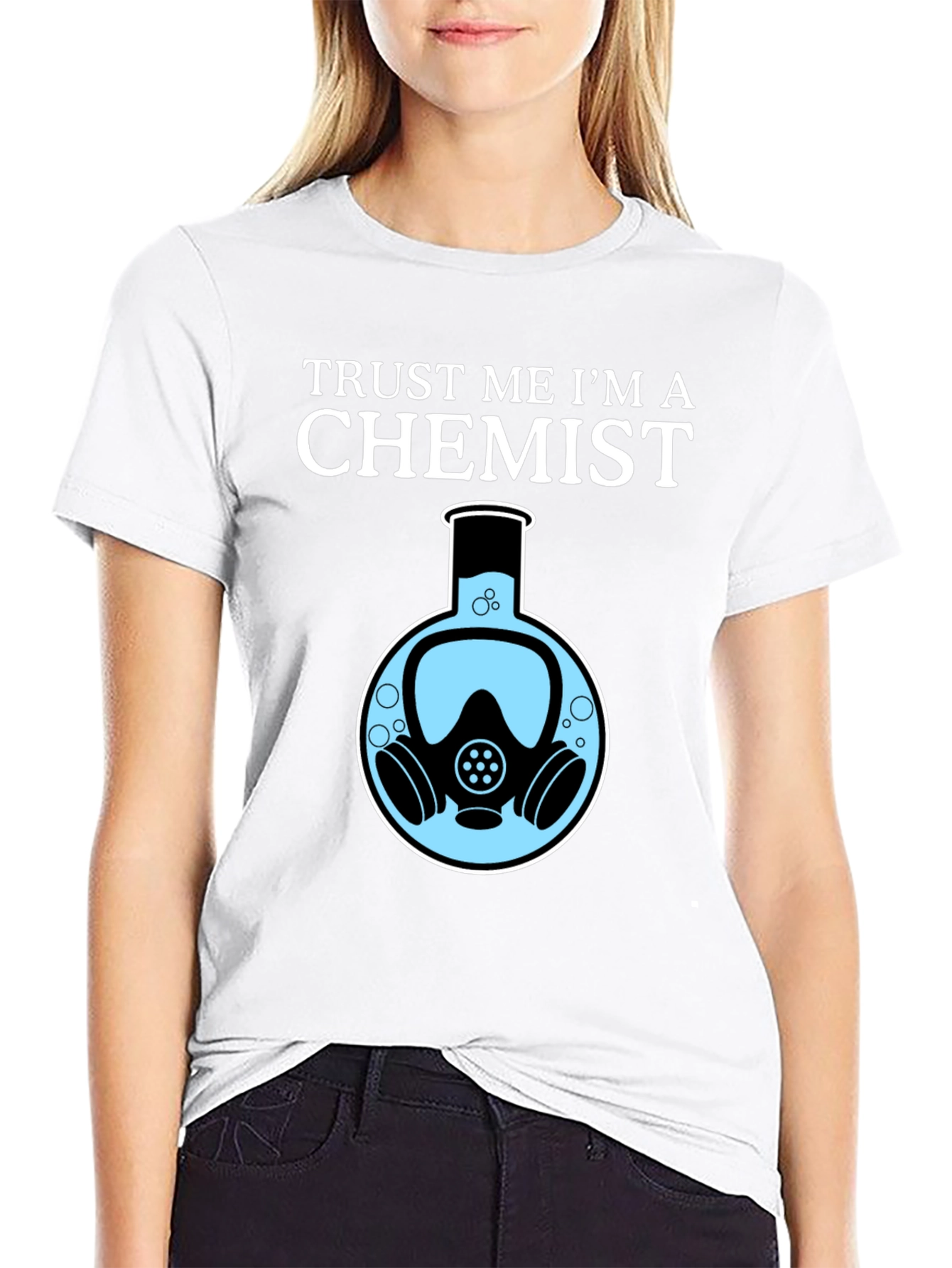 Show off your love for chemistry with this unique graphic t-shirt! The black tee features the text "Trust Me I'm A Chemist" above an artistic flask design. Inside the flask, a gas mask provides a clever and geeky twist. The shirt is made from a comfortable material and has a classic fit. This t-shirt is perfect for chemistry students, teachers, or anyone who appreciates science-themed apparel. Wear it to class, a lab session, or any casual occasion. It also makes a great gift for the chemist in your life!